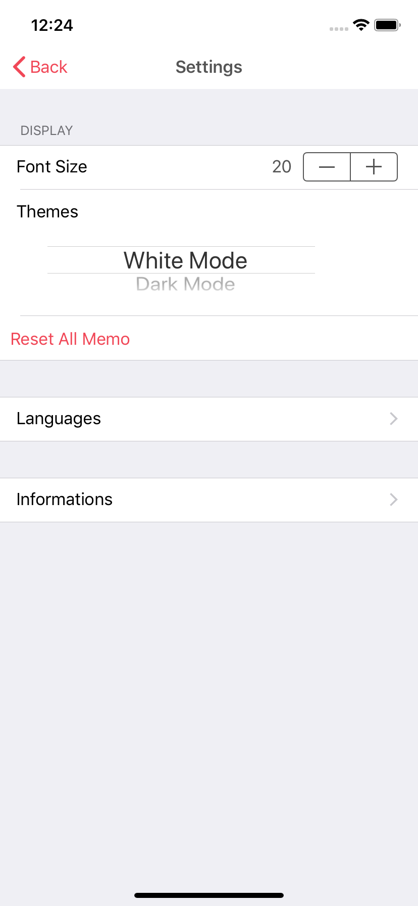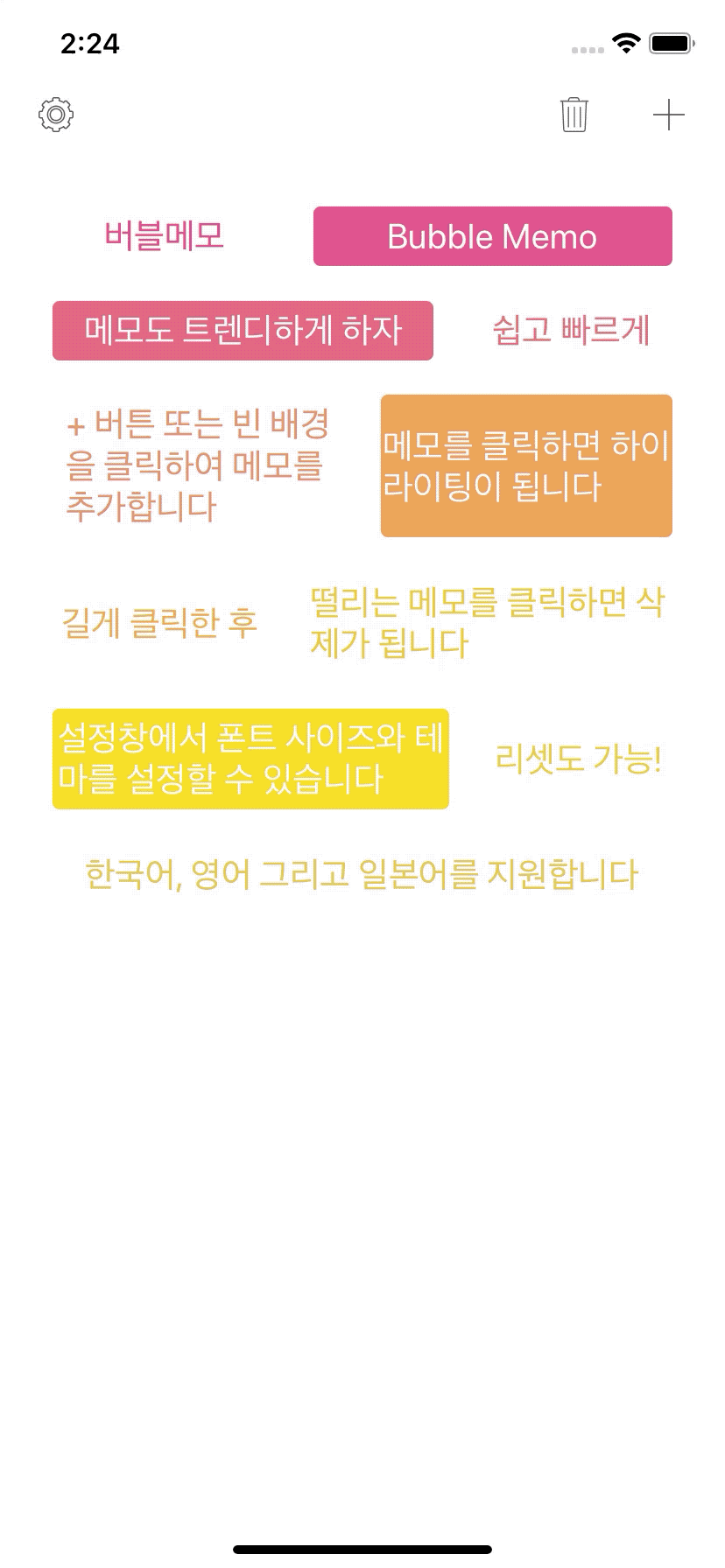 설정창에서 폰트의 크기, 테마, 언어를 바꿀 수 있으며,